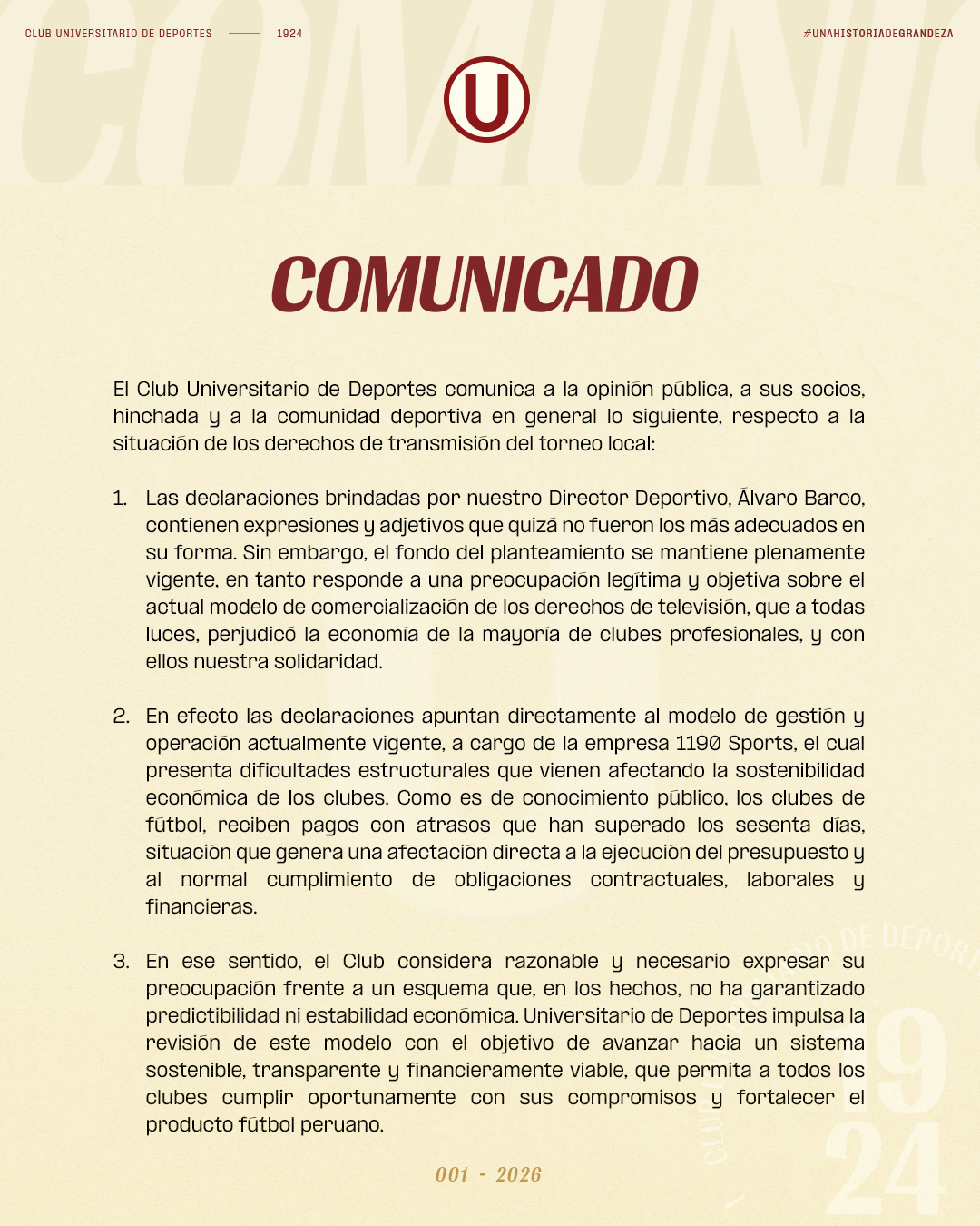 - Las declaraciones brindadas por nuestro Director Deportivo, Álvaro Barco, contienen expresiones y adjetivos que quizá no fueron los más adecuados en su forma. Sin embargo, el fondo del planteamiento se mantiene plenamente vigente, en tanto responde a una preocupación legítima y objetiva sobre el actual modelo de comercialización de los derechos de televisión, que a todas luces, perjudicó la economía de la mayoría de clubes profesionales, y con ellos nuestra solidaridad.