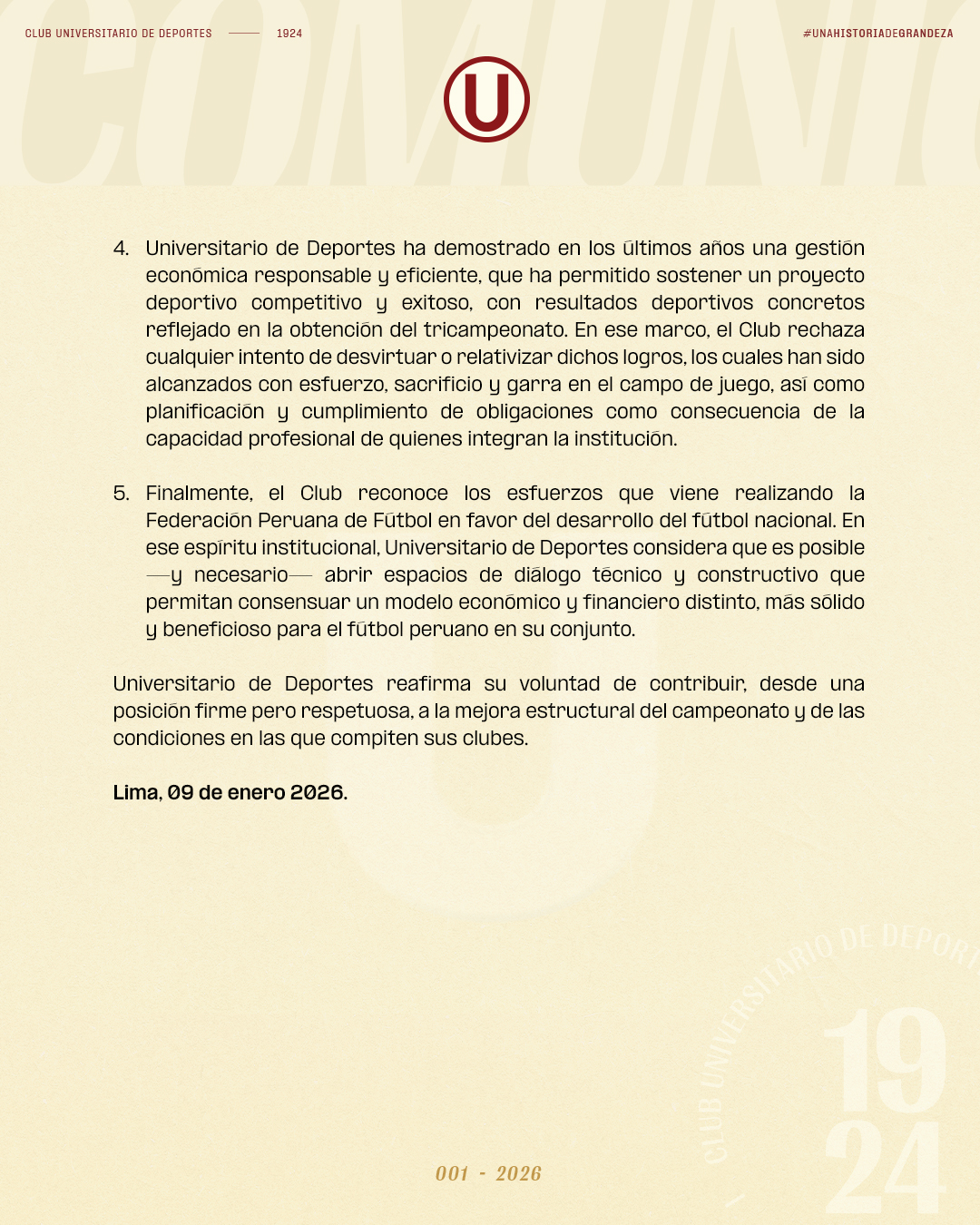 - Finalmente, el Club reconoce los esfuerzos que viene realizando la Federación Peruana de Fútbol en favor del desarrollo del fútbol nacional. En ese espíritu institucional, Universitario de Deportes considera que es posible —y necesario— abrir espacios de diálogo técnico y constructivo que permitan consensuar un modelo económico y financiero distinto, más sólido y beneficioso para el fútbol peruano en su conjunto.
