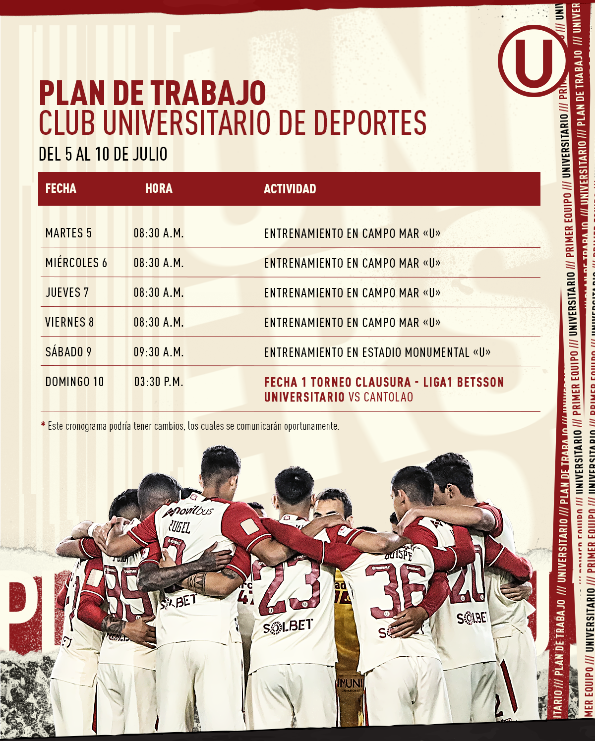 Con los ánimos al tope inició hoy la semana de entrenamiento el plantel de Universitario de Deportes, que tiene como objetivo, como manda nuestra historia, ser protagonista del último torneo de la temporada. El rival a vencer será la Academia Cantolao, que en la primera rueda fue goleado 3-0.