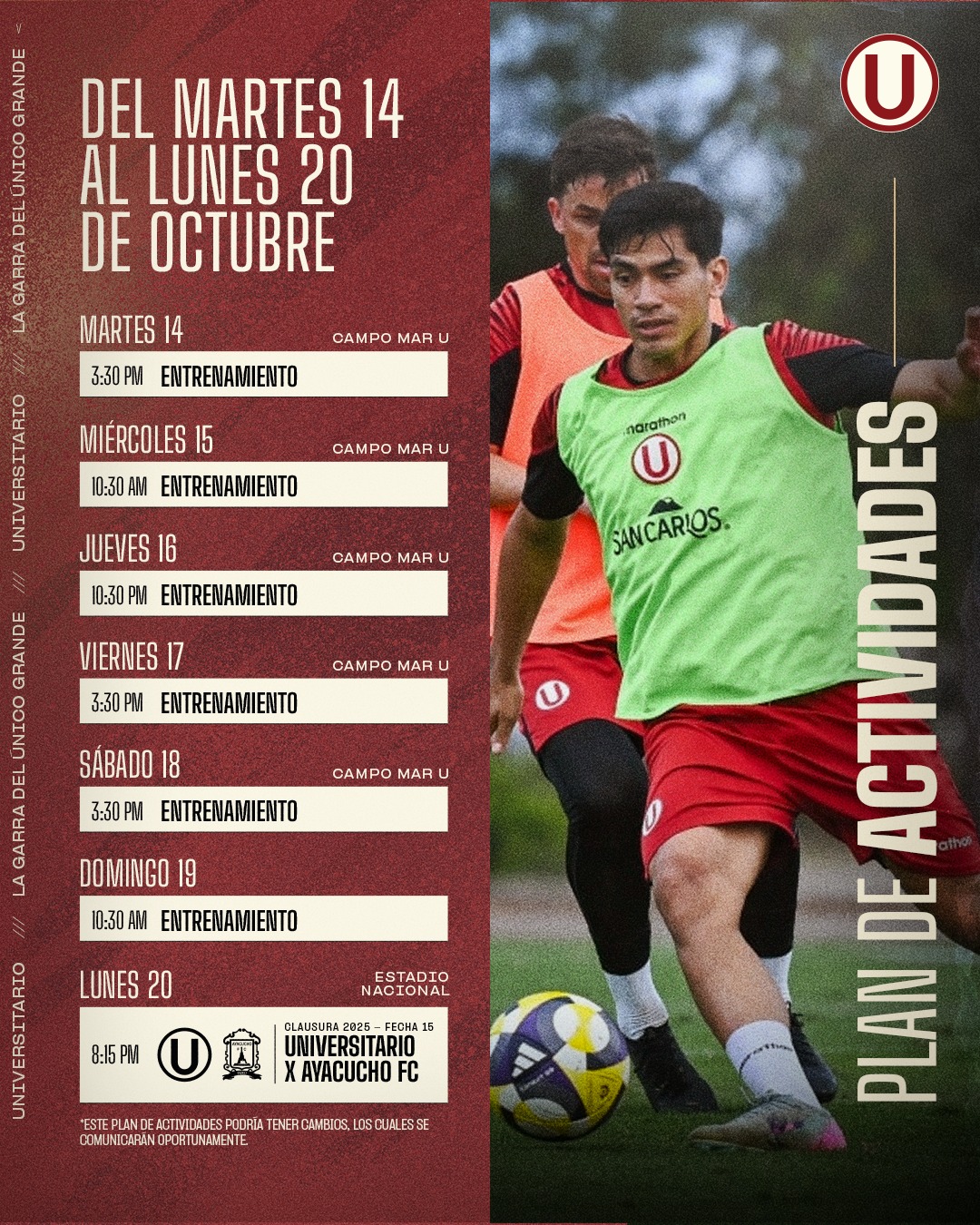 Plan de actividades del primer equipo de UniversitarioSábado 4 octubre: Noticias Primer Equipo