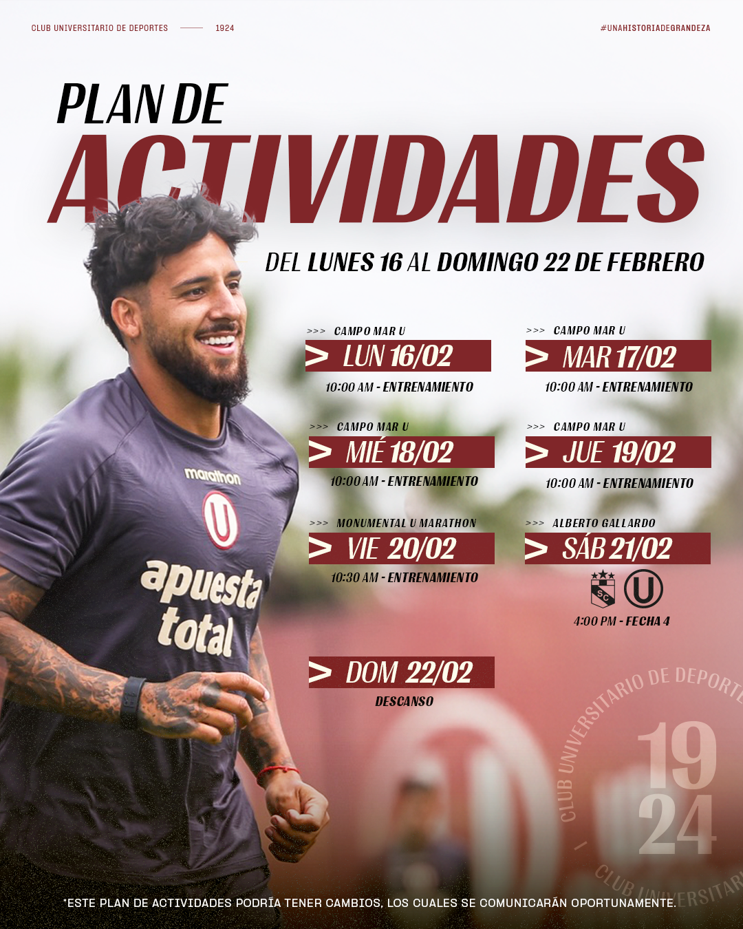 Como es costumbre, el elenco merengue realizará sus prácticas en su sede de Campo Mar 'U' y, a un día del duelo por la cuarta fecha, en el Estadio Monumental U Marathon.
