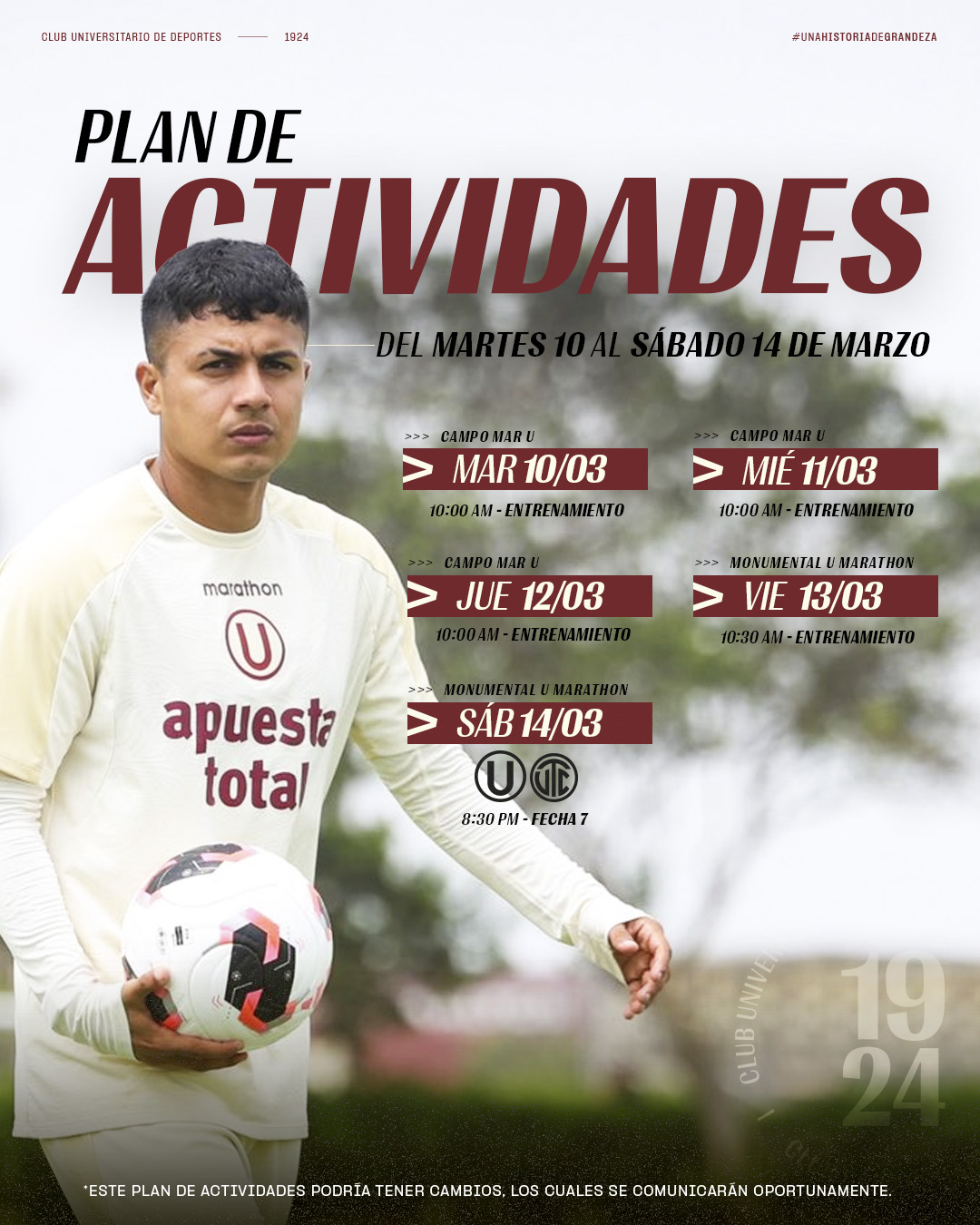 Como es costumbre, el cuadro merengue realizará sus prácticas en su sede de Campo Mar 'U' y, a un día del duelo por la séptima fecha, en el Estadio Monumental U Marathon.