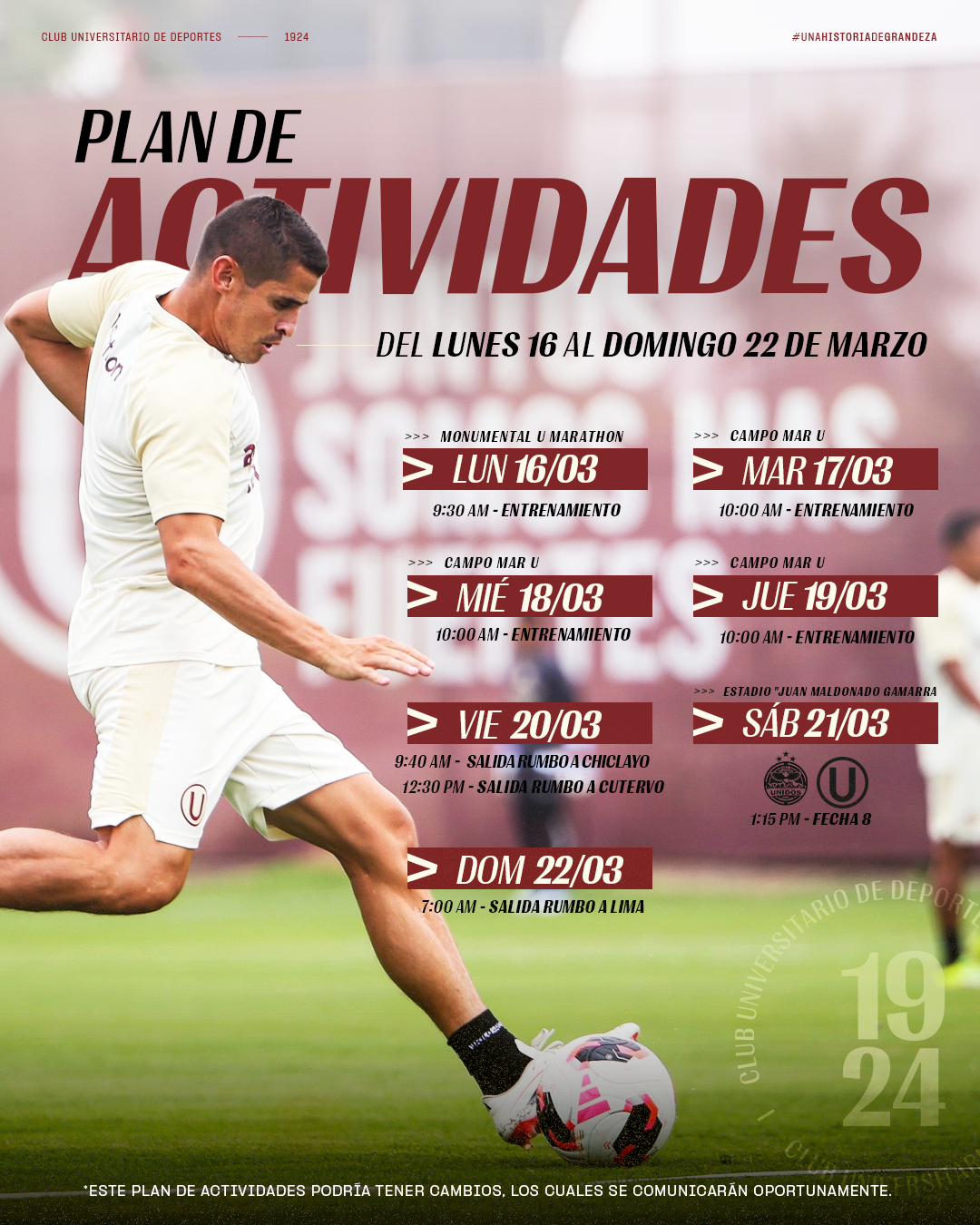 El Club Universitario de Deportes, el único grande del Perú, no detiene su andar y hoy retoma los entrenamientos matutinos en el Estadio Monumental U Marathon. El equipo merengue realizará sus prácticas pensando en Comerciantes Unidos, su próximo rival por la fecha 8 del Torneo Apertura.