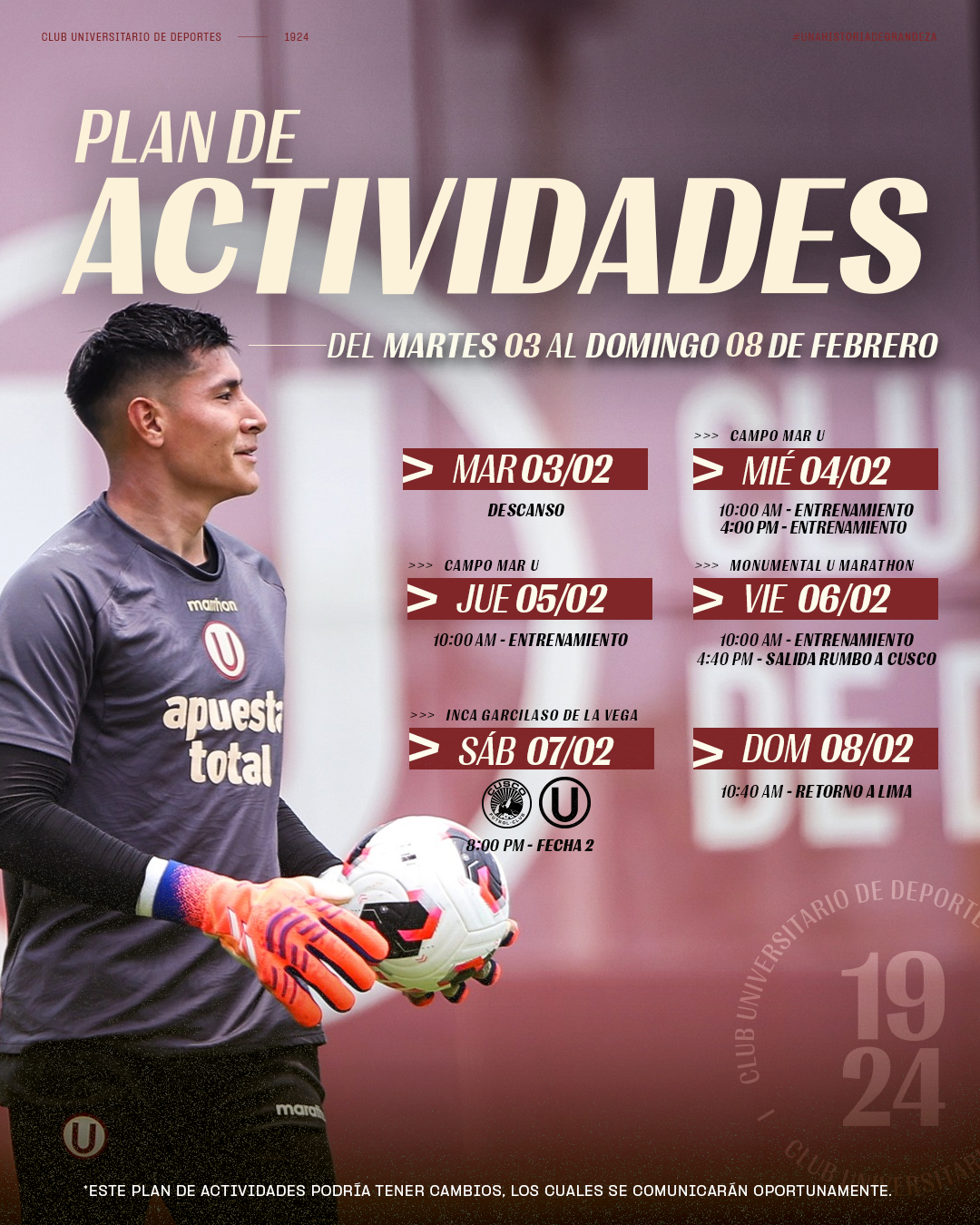 El plantel principal del Club Universitario de Deportes volverá a las prácticas mañana, miércoles 4 de febrero, en su sede de Campo Mar 'U', lugar donde también entrenará el jueves. El día viernes, los dirigidos por el profesor Javier Rabanal realizarán su última sesión en el Estadio Monumental U Marathon, y por la tarde viajarán a Cusco.