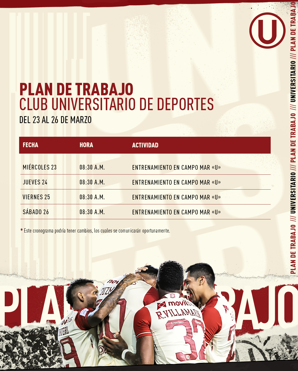 El primer equipo de Universitario de Deportes no se deteniene e iniciará sus entrenamientos a partir de hoy en su predio de Campo Mar ‘U’. El objetivo del más campeón del fútbol peruano está puesto en la fecha 8 del torneo local, donde se enfrentará a ADT de Tarma el próximo domingo 3 de abril en el Estadio Monumental a las 3:30 de la tarde.