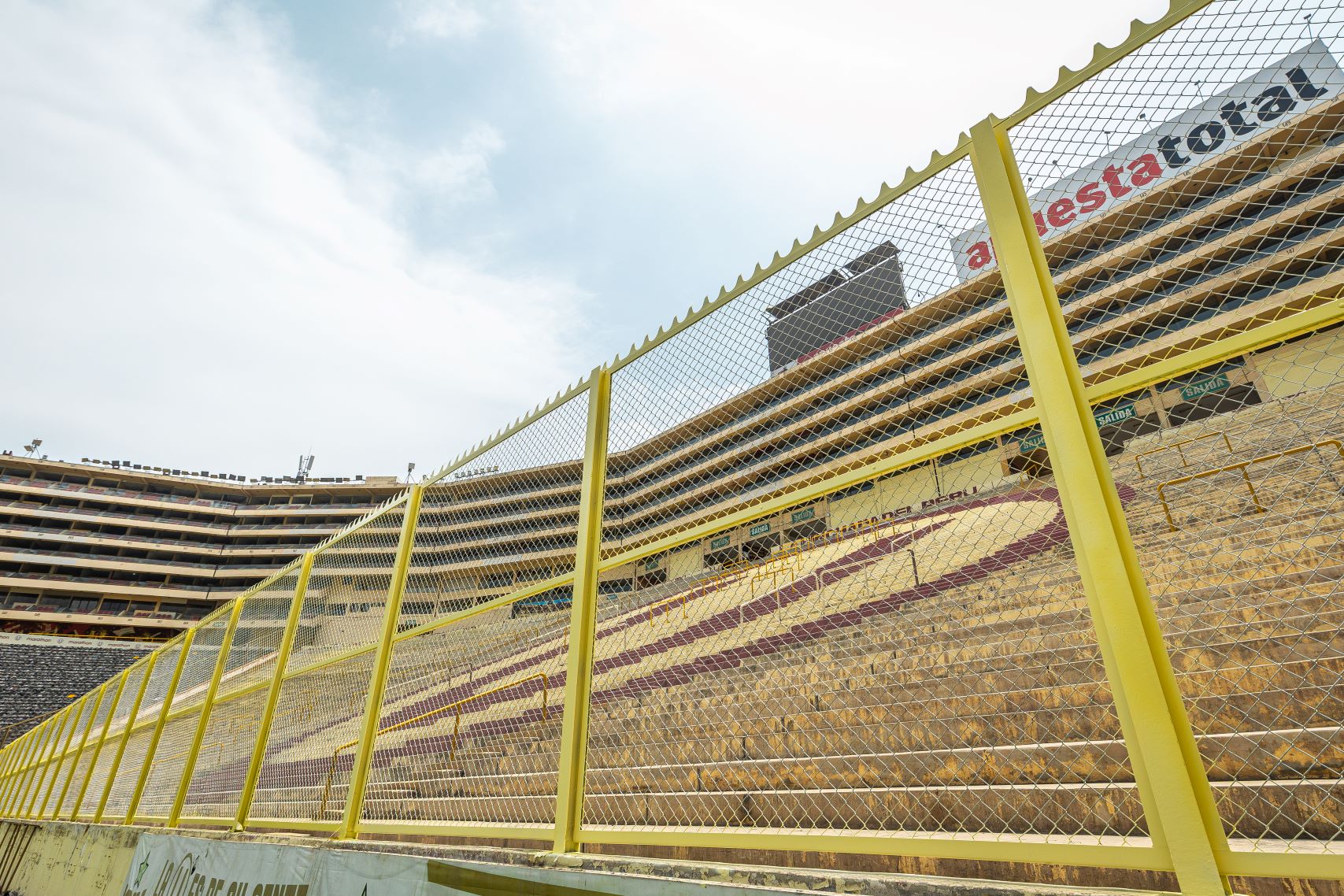En una primera etapa, los trabajos se concentraron en las tribunas norte y sur, donde se sustituyeron las mallas existentes por mallas olímpicas, instaladas sobre nuevos perfiles metálicos. Como parte de esta intervención, se optimizó el diseño y la altura de las estructuras bajo criterios técnicos que permiten una mejor visibilidad del campo de juego, manteniendo las condiciones de seguridad del recinto.