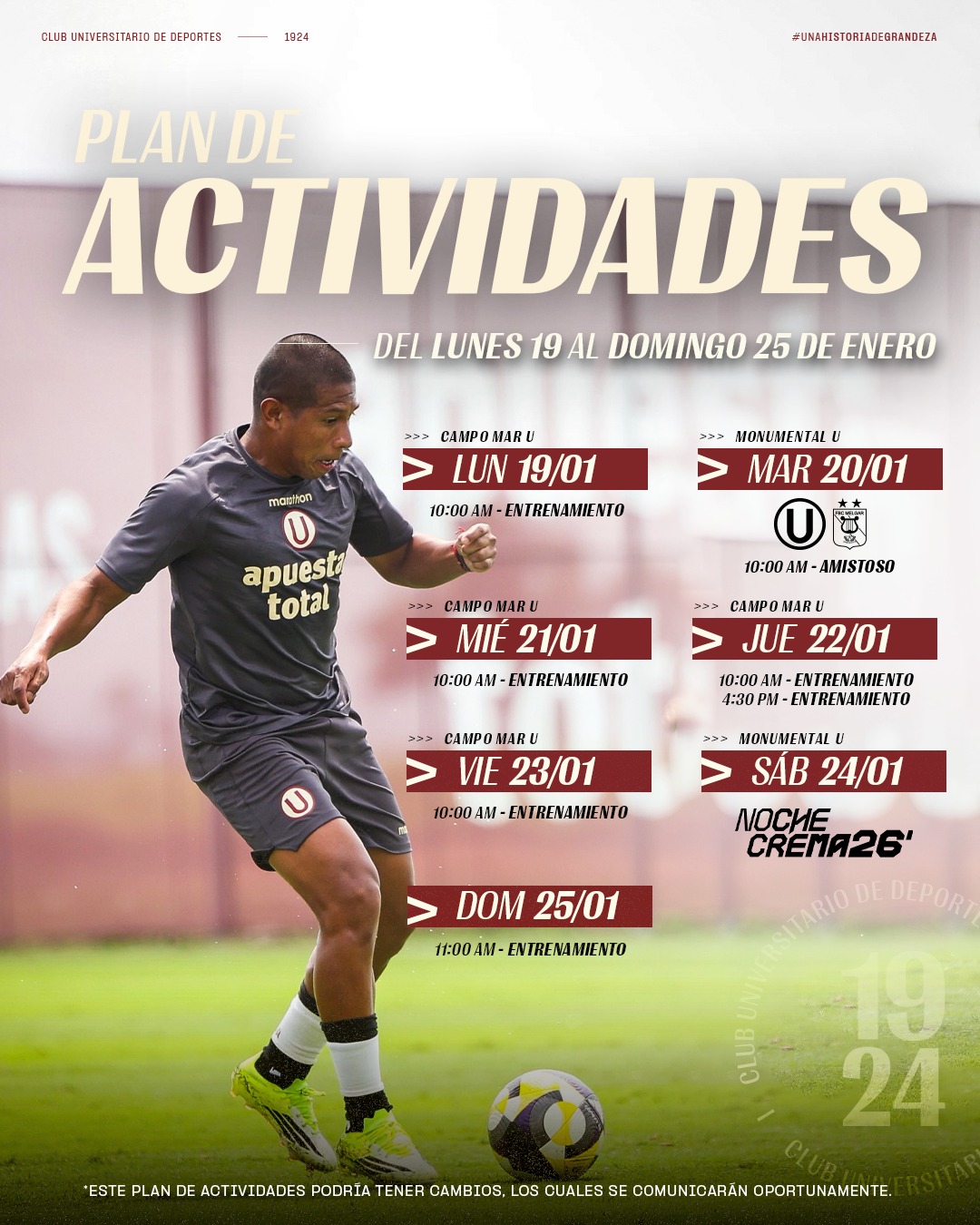 Semana de Noche Crema, semana de presentación oficial. El elenco merengue inicia hoy una semana cargada, de exigencia por la pretemporada y por los encuentros amistosos que sostendrá. El primero de ellos mañana ante Melgar y luego la noche de presentación, este sábado 24 frente a la Universidad de Chile, ambos en el Estadio Monumental U Marathon.